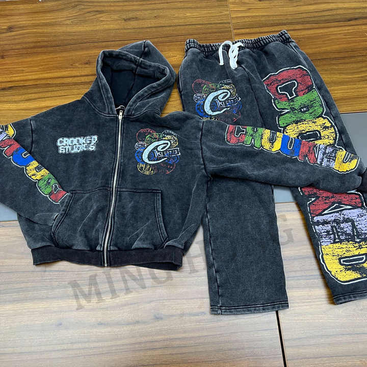 Survêtement à capuche et pantalon de survêtement zippé et délavé à l'acide, style de rue lourd et design