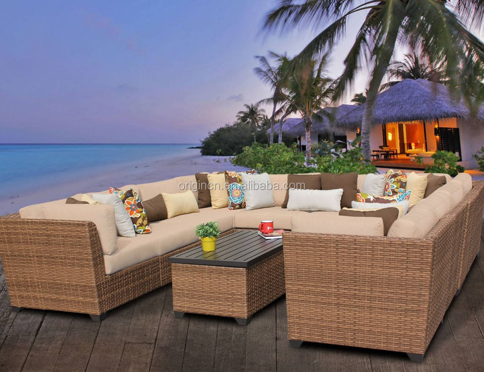 Ensemble de salon de jardin en rotin pour 10 personnes, avec table basse en métal en forme de U, pour les fêtes en plein air