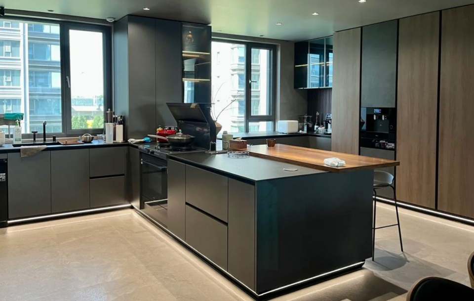 Conception Prêt à Assembler Armoires de Cuisine Îlot Panneau de Particules Carcasse Meuble de Cuisine Avec Bande Lumineuse Led