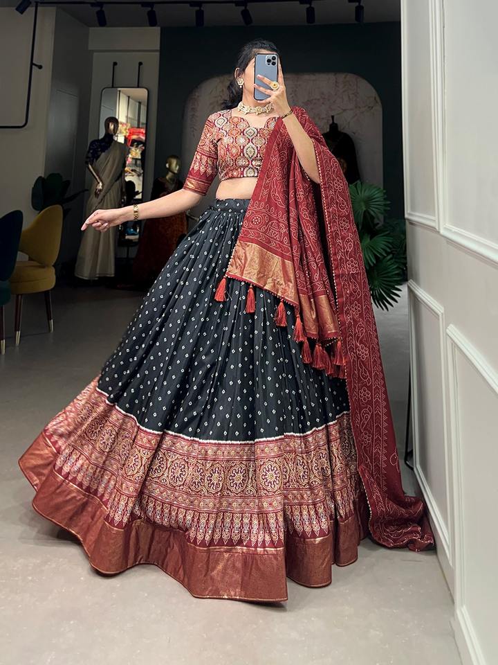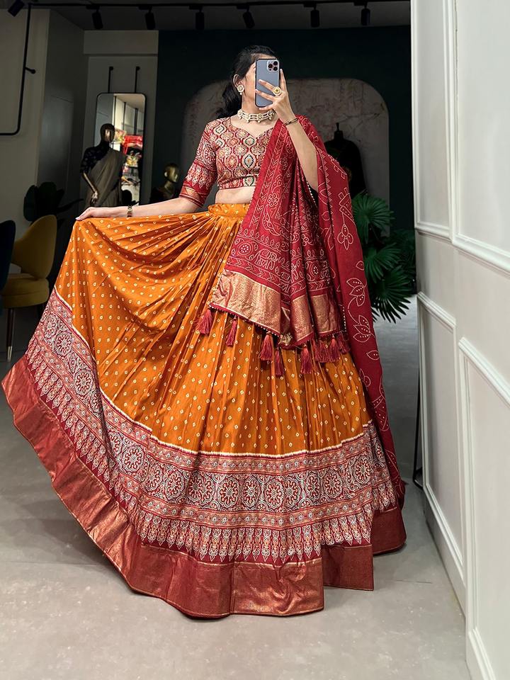 Designer Bandhani and Ajarakh Print With Foil Work Blouse and Pure Banarasi Silk Dupatta Lehenga Choli
