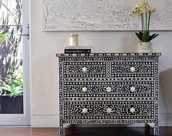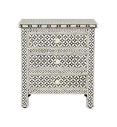 Table de rangement latérale en bois fait main avec incrustations de os, motif décoratif complexe, par un designer