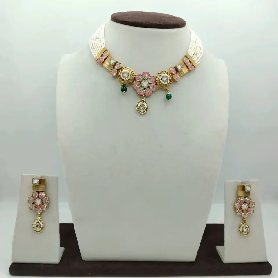 Parure de mariée de créateur, finition dorée, collier ras-du-cou floral avec pierres roses, couches de perles et boucles d'oreilles pendantes