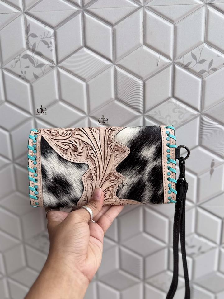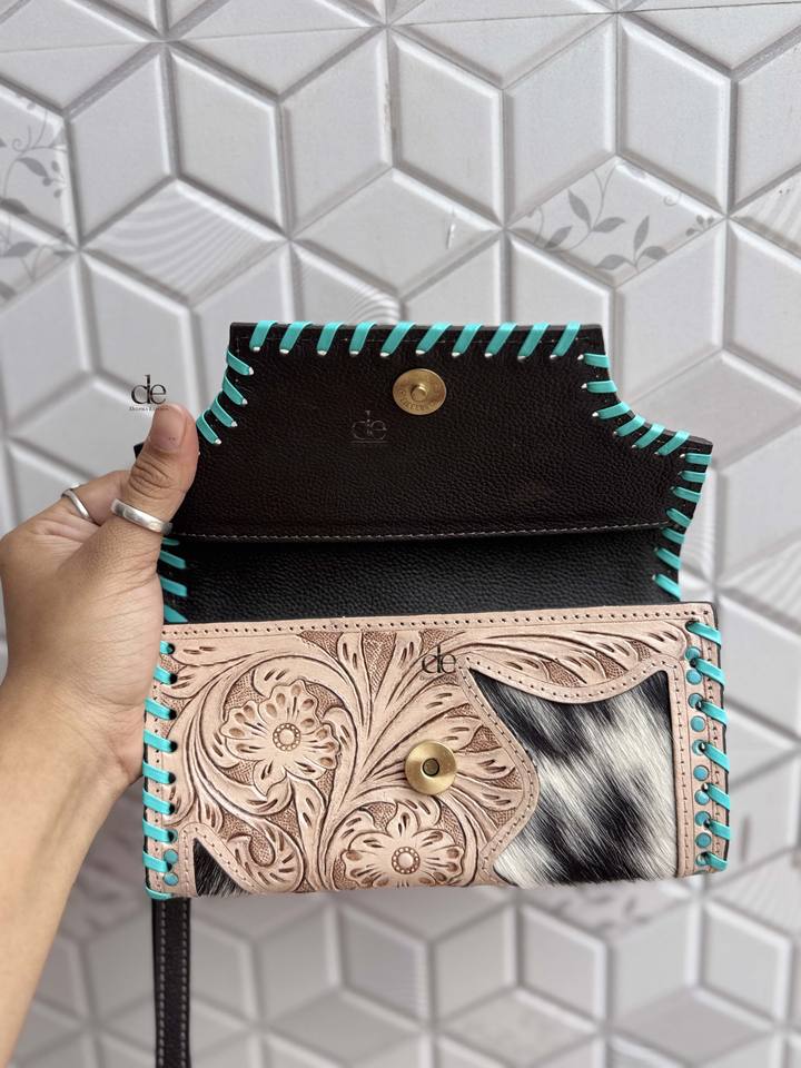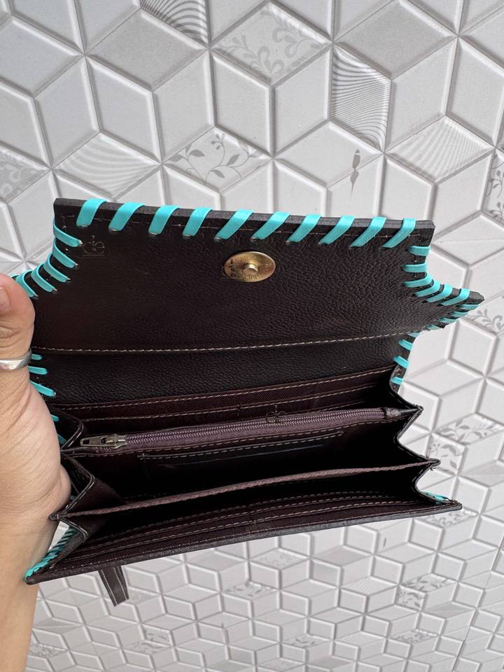 Pochette en cuir de fourrure de vachette usinée à la main portefeuille de sculpture Vintage couleur Turquoise cartes de crédit en cuir portefeuille cadeaux