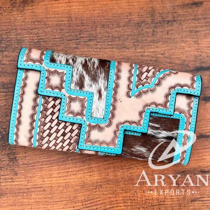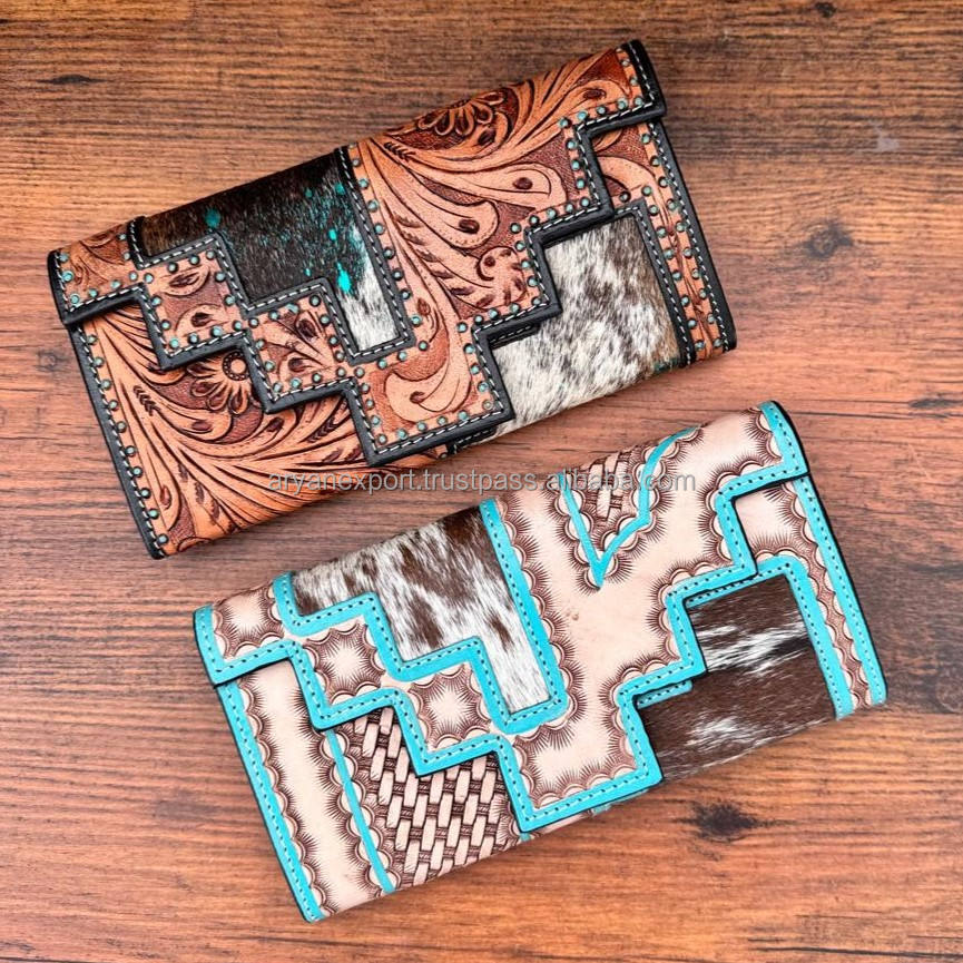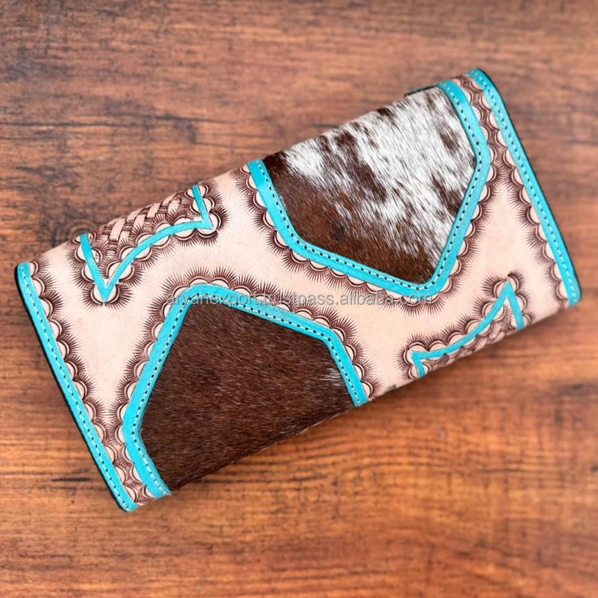Designer Cowhide Fur Leather Clutch Hand Tooled Carving Wallet Vintage Turquoise Color Leather Credit Cards Cash Wallet Gifts