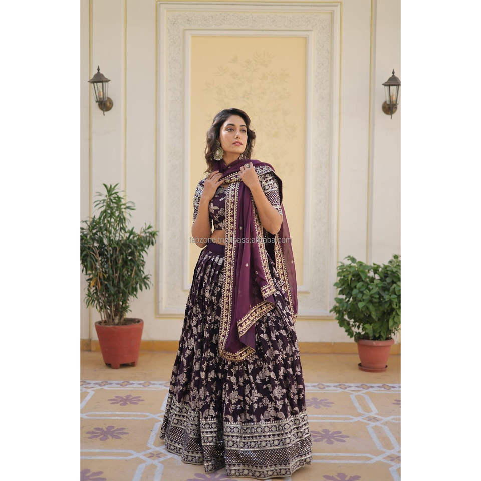 Ensemble Lehenga Choli et Dupatta en tissu jacquard de viscose pure, teintable par un designer
