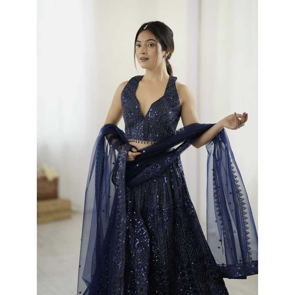 Robes de soirée de créateur, Lehenga Choli en filet avec des sequins et des travaux de dori pour les fêtes