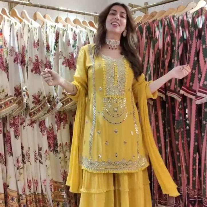 Ensemble Sharara en Faux Georgette de Créateur pour Femme – Broderie Lourde et Sequins 9MM pour Tenue de Fête avec Dupatta