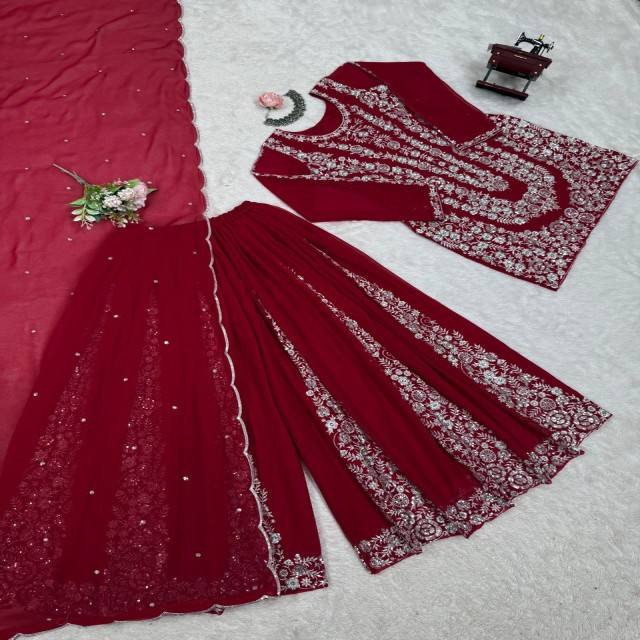 Ensemble de costume en fausse georgette de créateur, fil et paillettes travaillés sur le dessus, plazo jusqu'à la taille 44 et dupatta avec broderie assortie