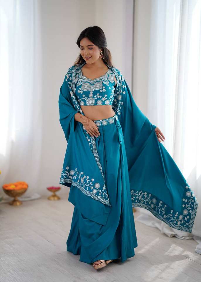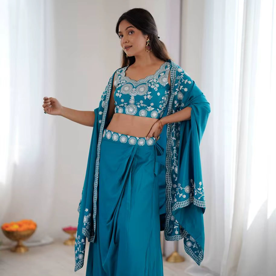 Ensemble Dhoti Western en Crêpe Français de Créateur avec Shrug Brodé et Choli Non Cousu