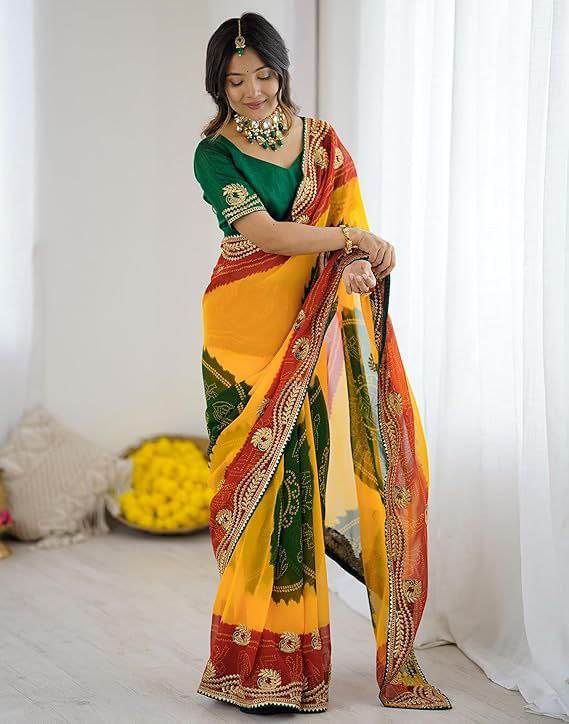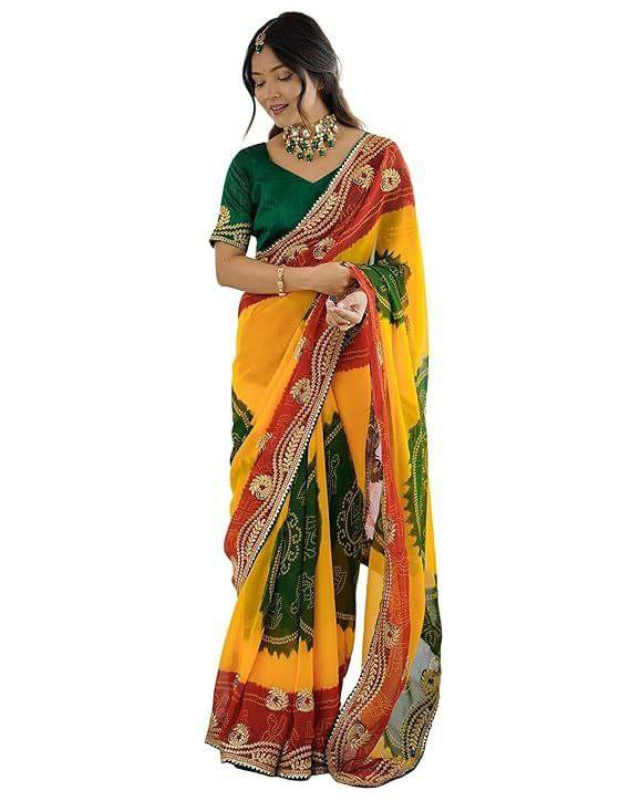 Sari en Georgette imprimé de la marque Mill avec broderies riches et chemisier brodé en soie monofilament pour une tenue festive élégante