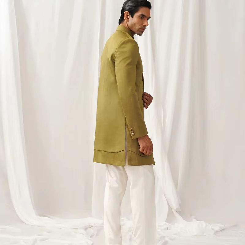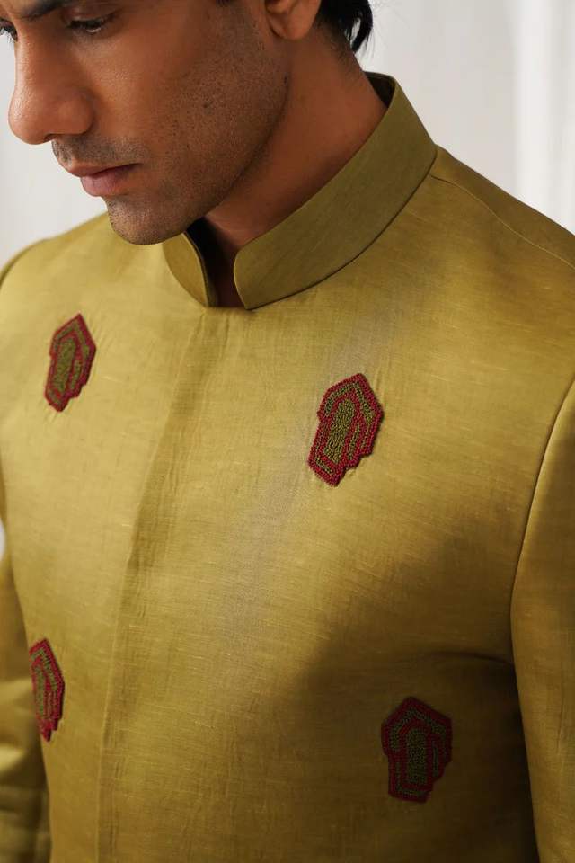 Designer Gold Achkan Bandhgala Sherwani for Men Viscose Traditional Style with Silk Embroidery and Sequence Work for Parties