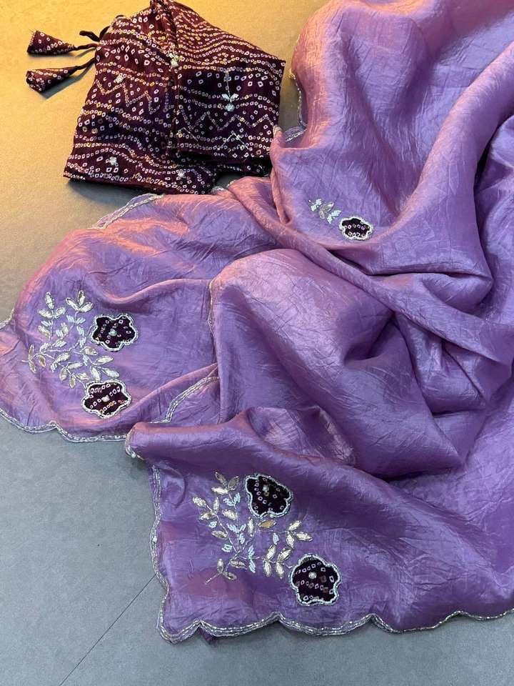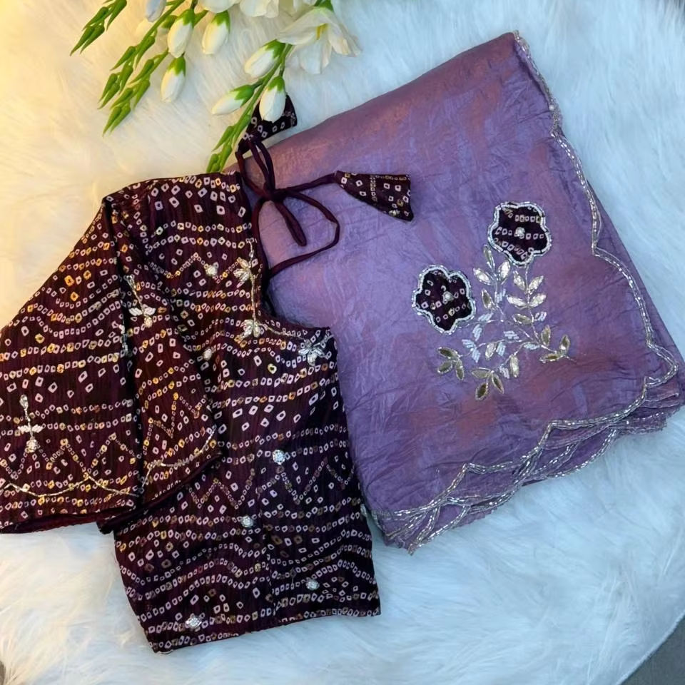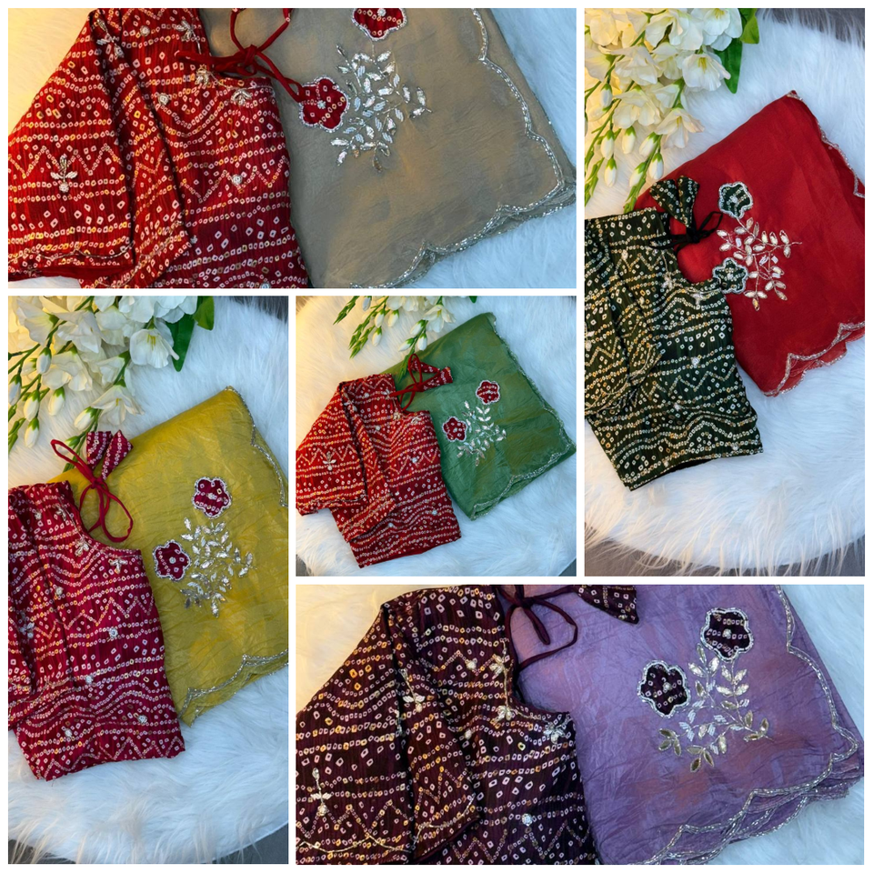 Designer Gold Crush Soft Two-Tone Sari avec Bandhej Handwork Cutdana Butta Neck Sleeve Blouse Piece for Parties