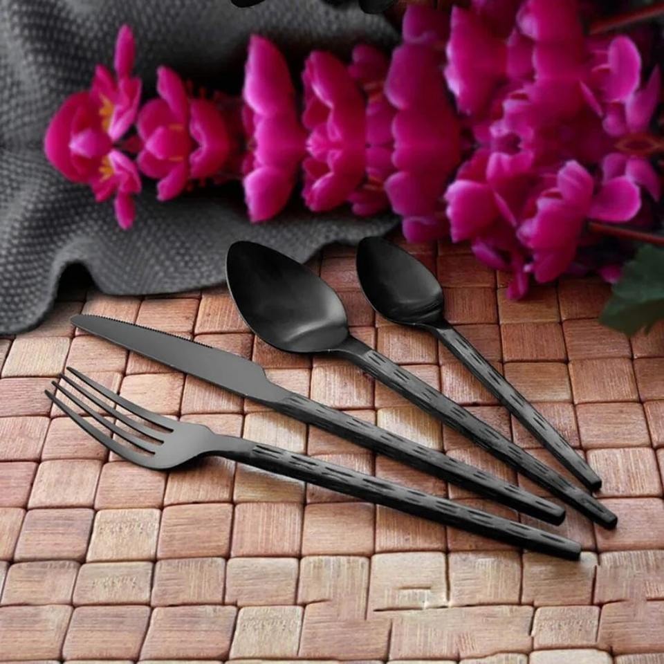 Ensemble de couverts en acier inoxydable doré design, manche rustique noir, cuillère, fourchette, couteau de qualité supérieure, vaisselle pour la cuisine