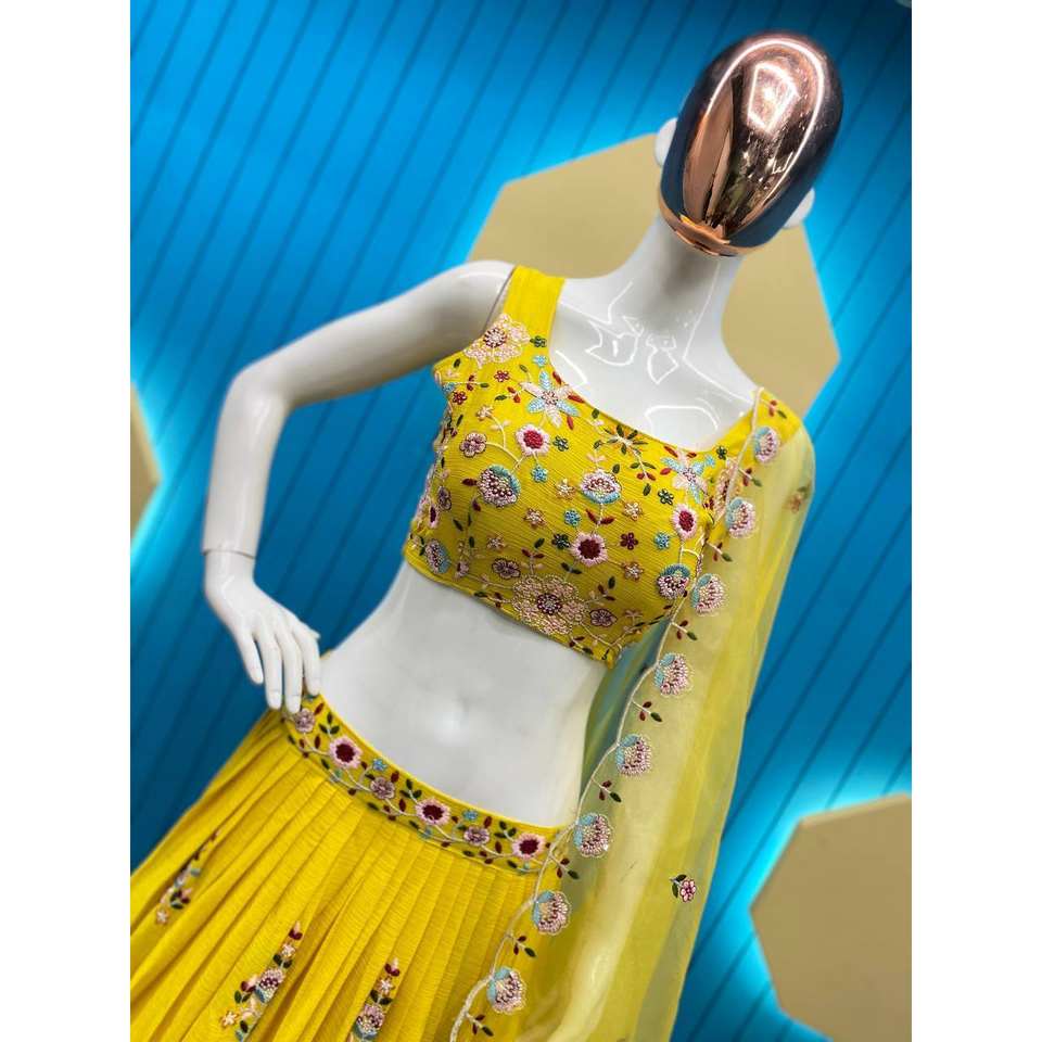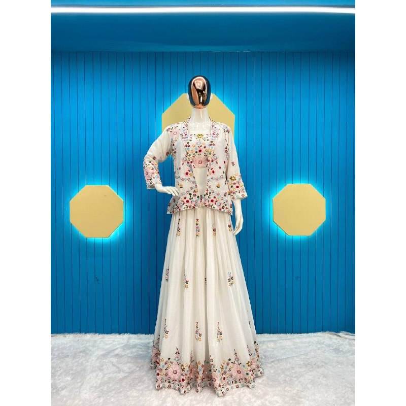 Designer Handmade A-Line Koti-Lehenga Choli Dupatta Set with Floral Print Organza Fabric Party Wear Look with Natural Waistline