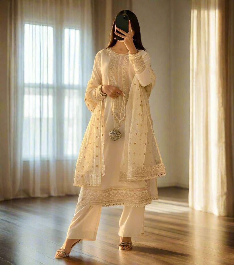 Chanderi Soie Séquence Broderie Haut Bas & Dupatta