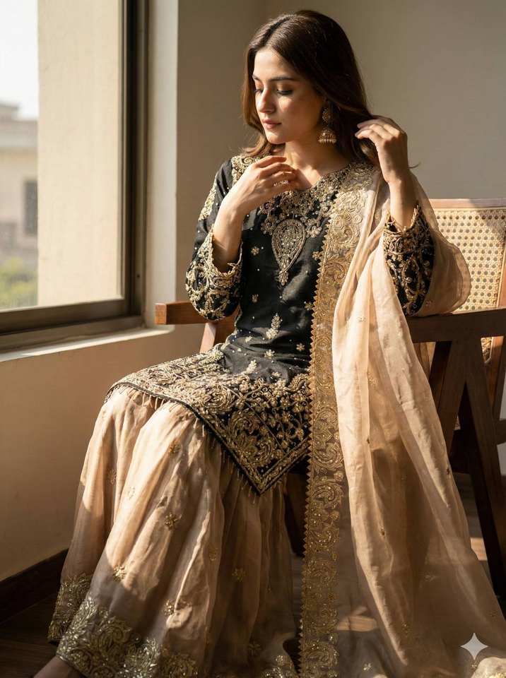 Ensemble Sharara en soie brodée de luxe avec dupatta à bordure en dentelle