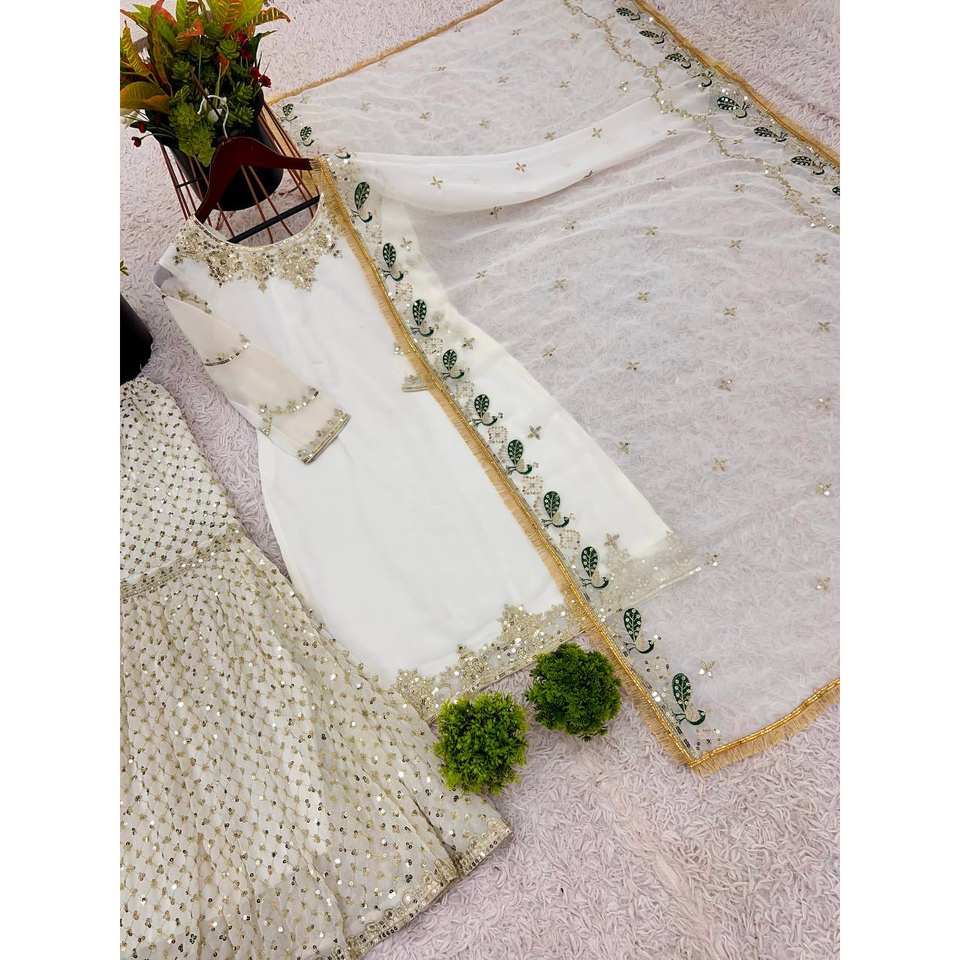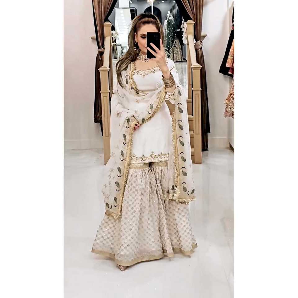 Ensemble Plazzo et Dupatta brodé lourd de style indien et pakistanais pour une tenue de soirée élégante