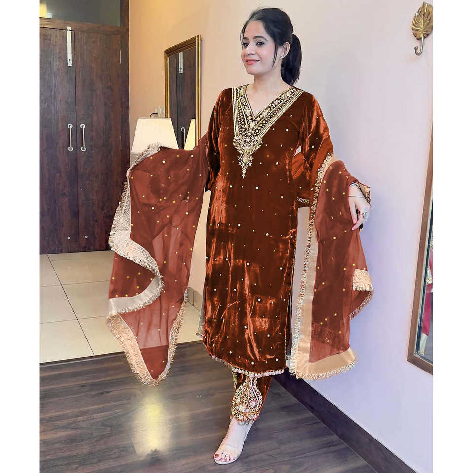 Ensemble haut en velours de viscose pur de créateur, manches trois-quarts, pantalon palazzo et dupatta, idéal pour les soirées