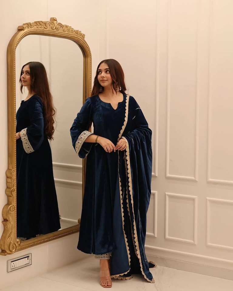 Ensemble 3 pièces en velours viscose lourd de créateur Nouvel ensemble de robe de soirée traditionnelle Pantalon assorti Dupatta Ethnique Salwar Kameez