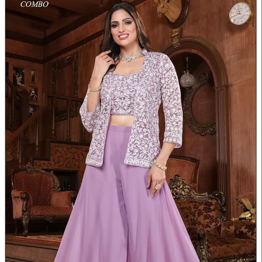 Ensemble de costume palazzo indo-occidental pour femmes avec veste brodée et haut court pour les fêtes, les mariages et les occasions spéciales
