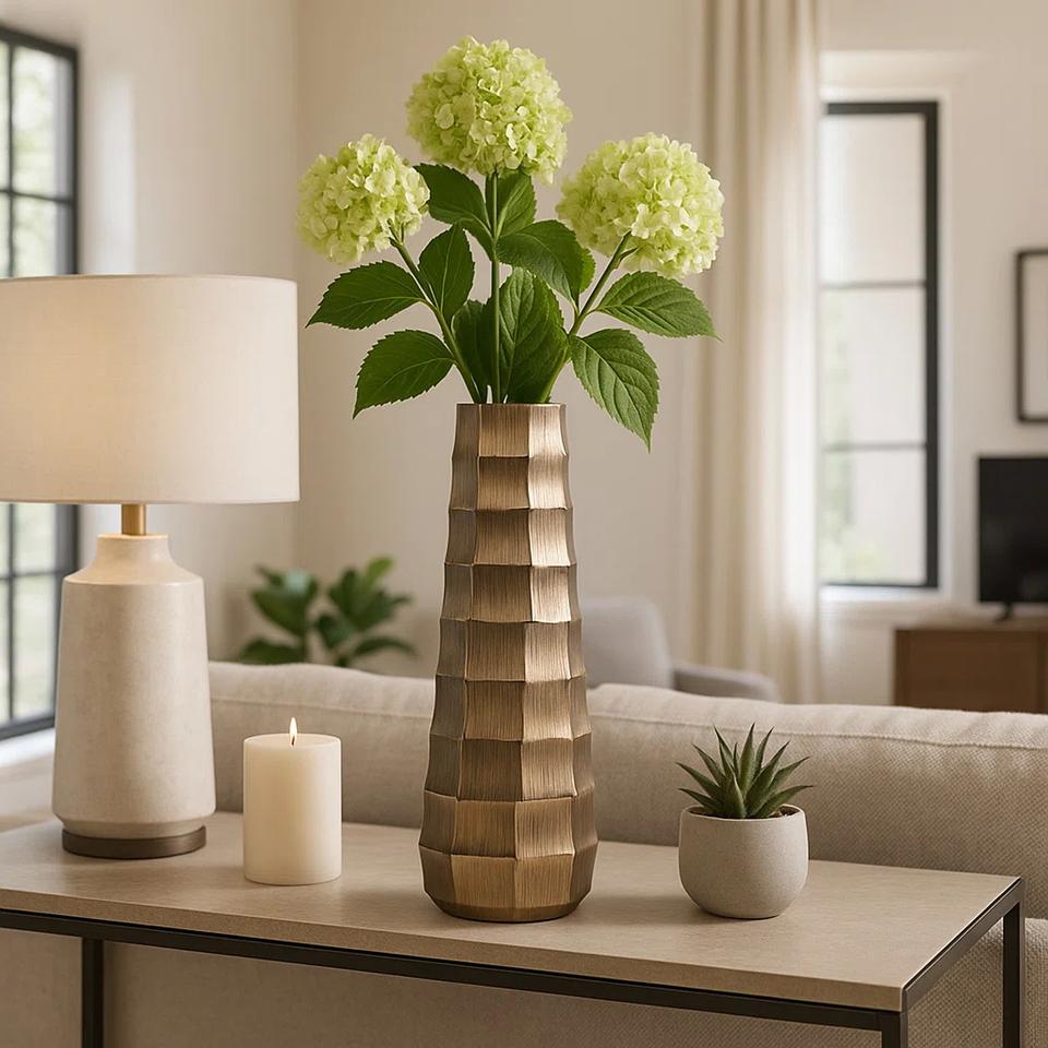 Vase décoratif en métal design pour présentation sur table, accent de décoration intérieure haut de gamme pour événements et intérieurs