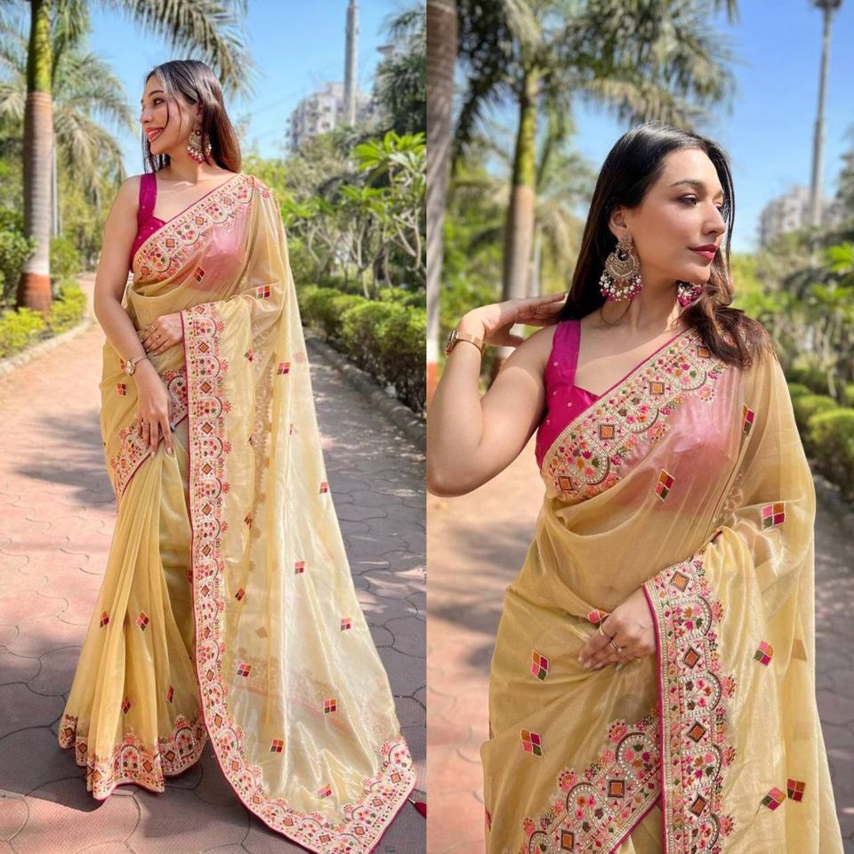 Sari en filet brodé de diamants de créateur, design ethnique moderne, lavable, non cousu, pour fêtes et mariages, pour femme Fatema