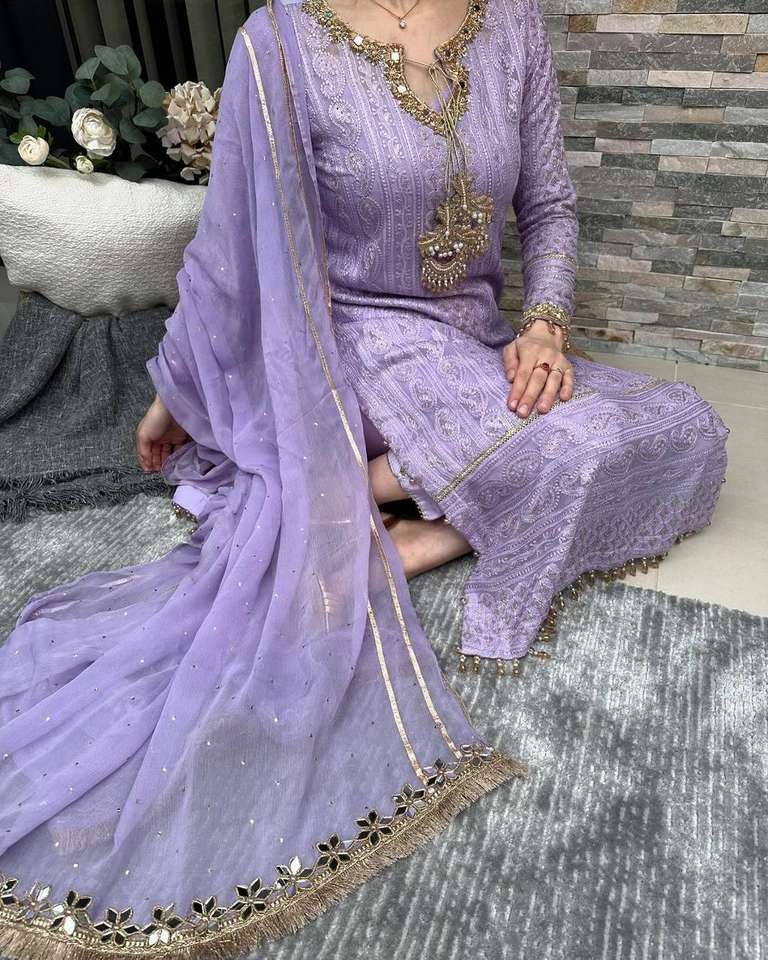 Designer Party Wear Faux Georgette Top Bottom & Dupatta Set Avec Broderie Séquence Travail Avec Pal Moti & Real Mirror Hand Work