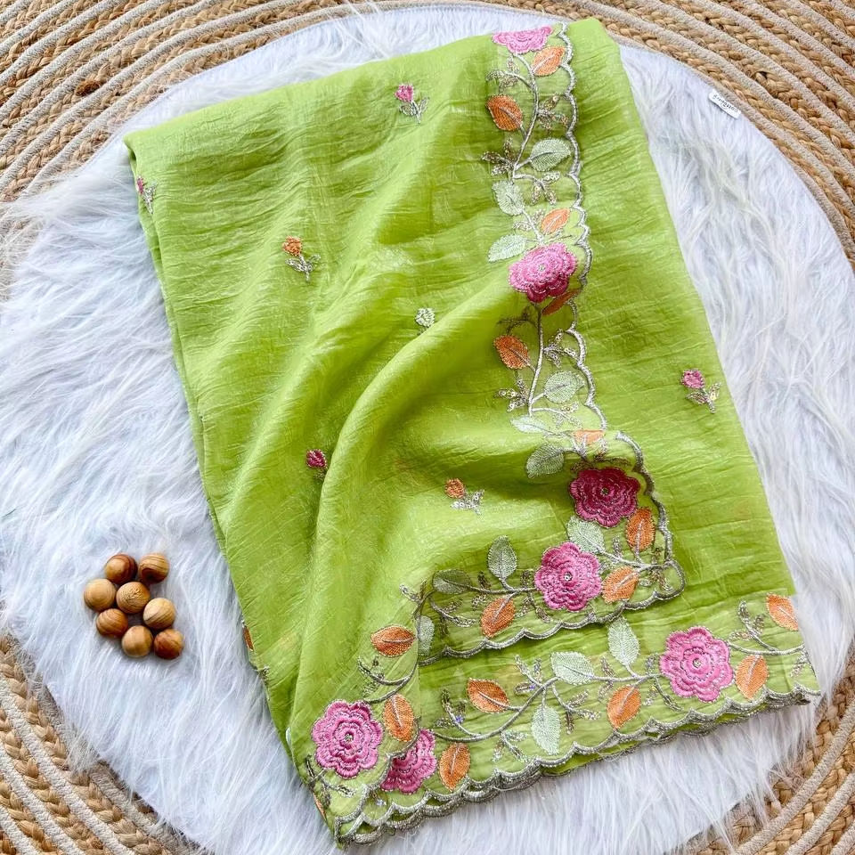 Saree de soirée de créateur avec un beau filet papillon lourd brodé Séquence de travail Sari de mariage en soie