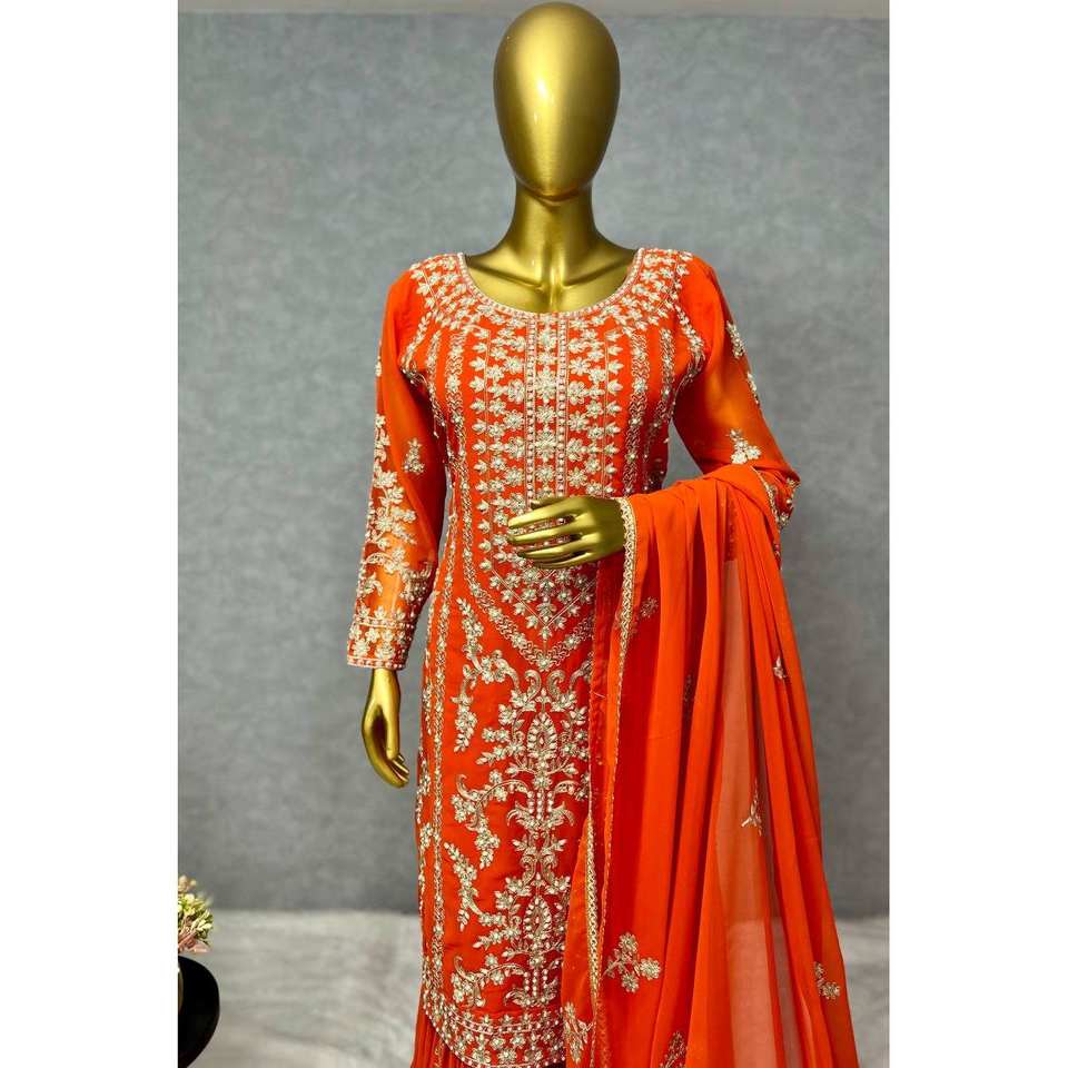Ensemble haut et sharara de soirée de créateur taille XL avec dupatta, orné de perles et de pierres faites à la main