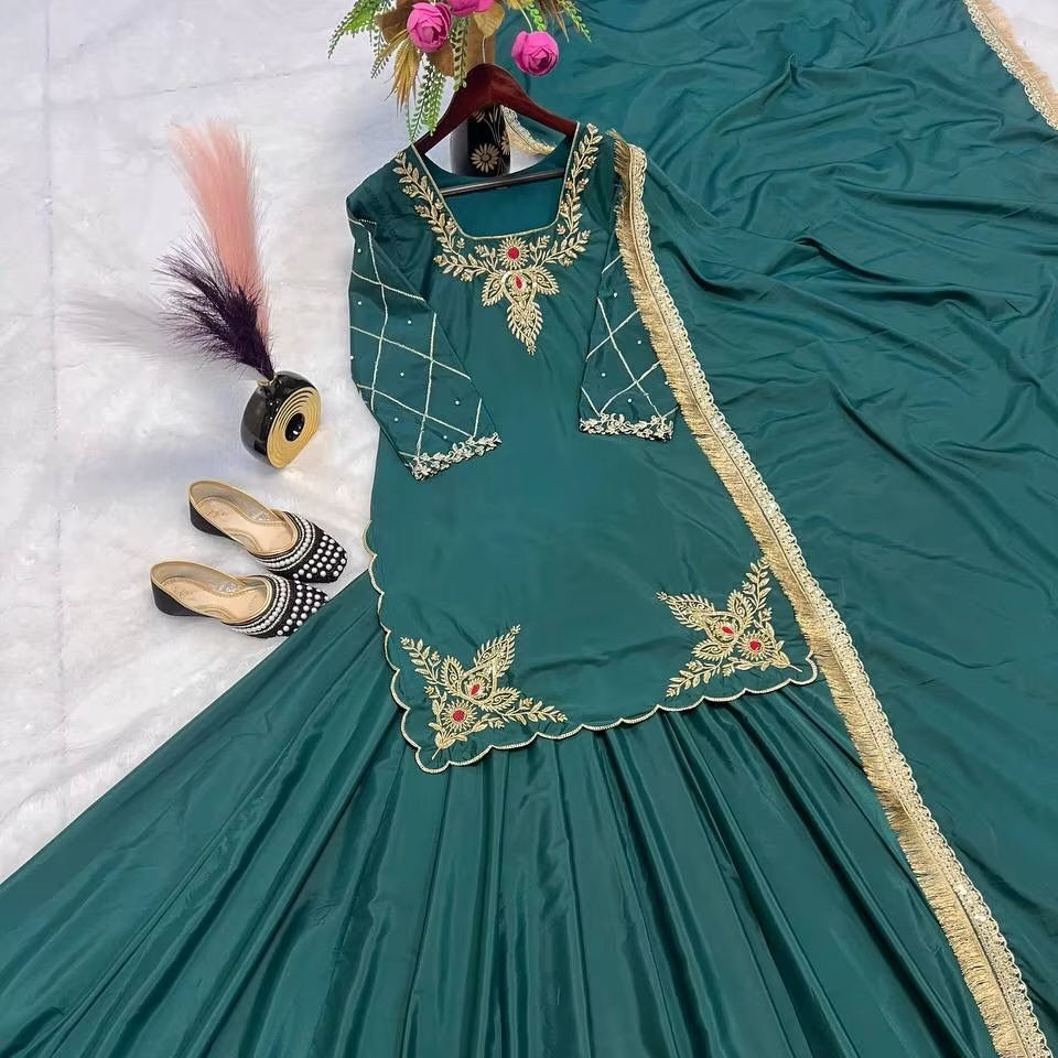 Set de soirée de mariage Crape Silk Sequence & Zari Embroidery Top and Lehenga With Sequence Fancy Lace Border Dupatta