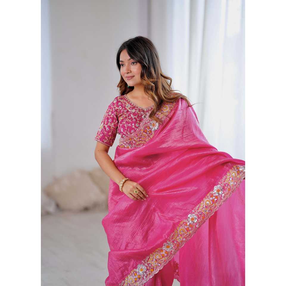 Designer Performance Wear Saree rose non cousu avec des fils à broder pour le codage des paillettes