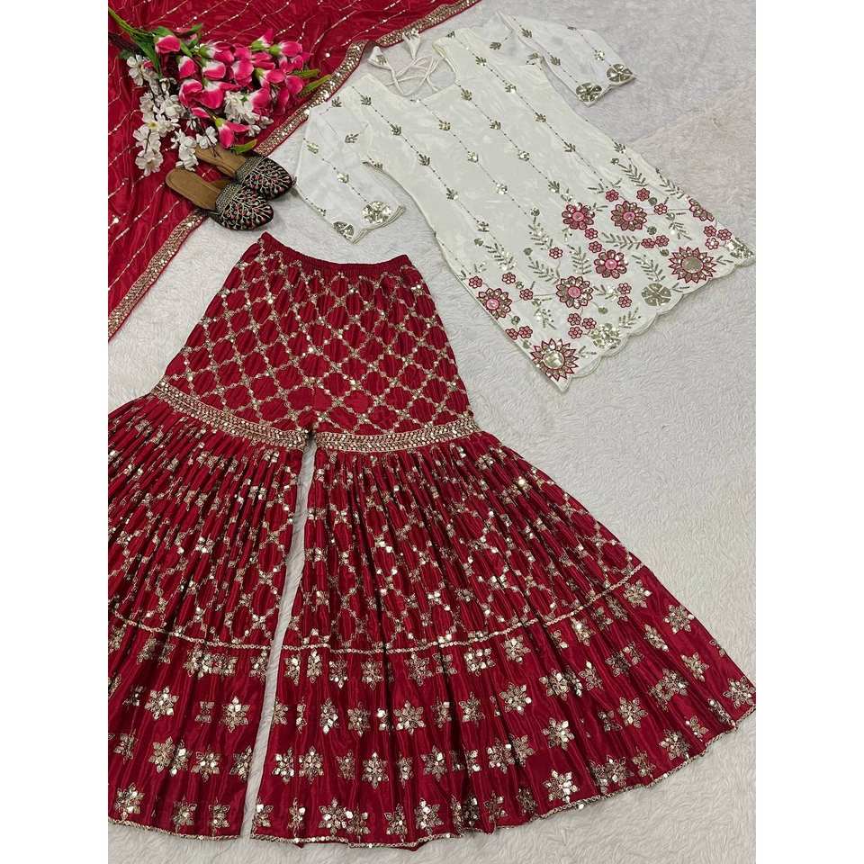 Ensemble de soirée élégant en polyester de créateur : haut Salwar Kameez avec pantalon Sharara Plazzo et Dupatta