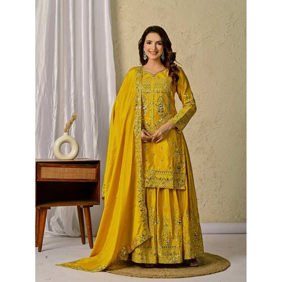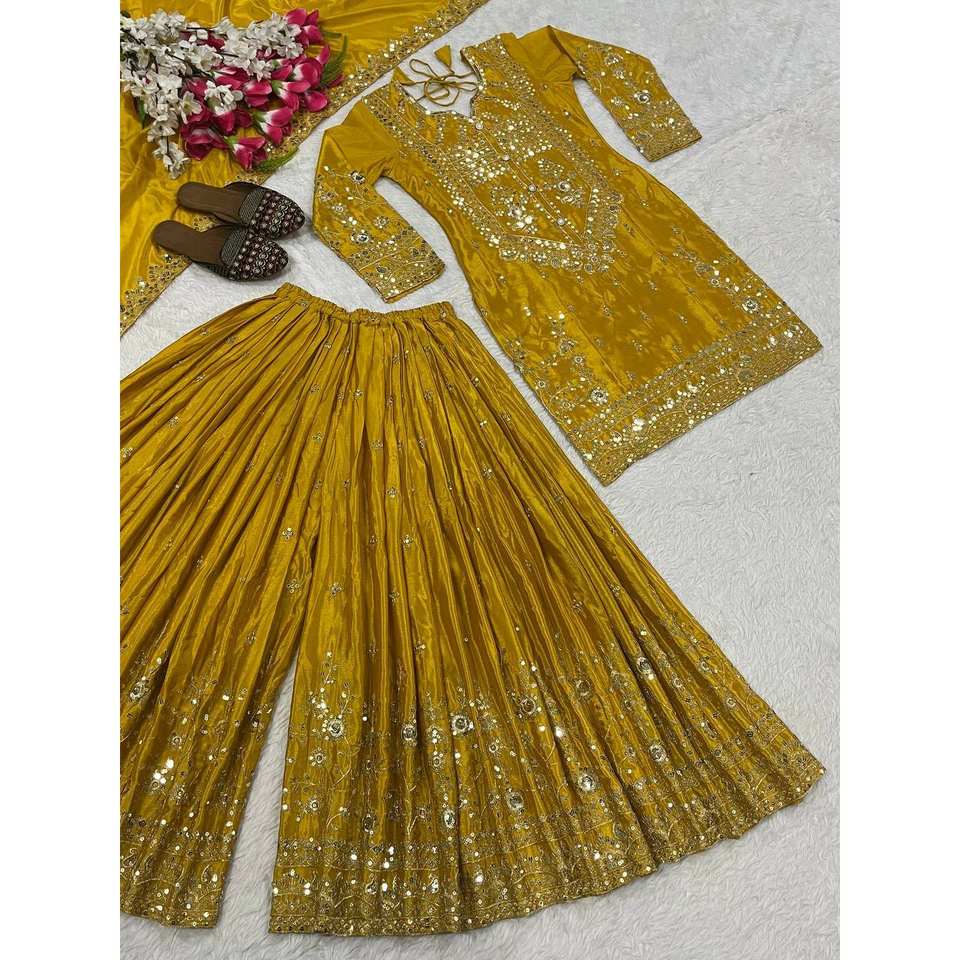 Ensemble de soirée élégant en polyester de créateur : haut Salwar Kameez avec pantalon Sharara Plazzo et Dupatta