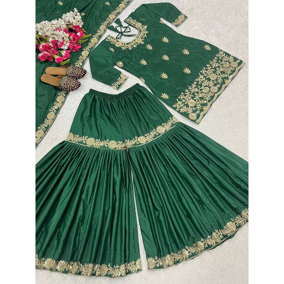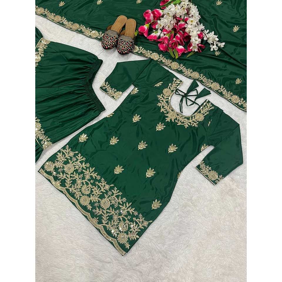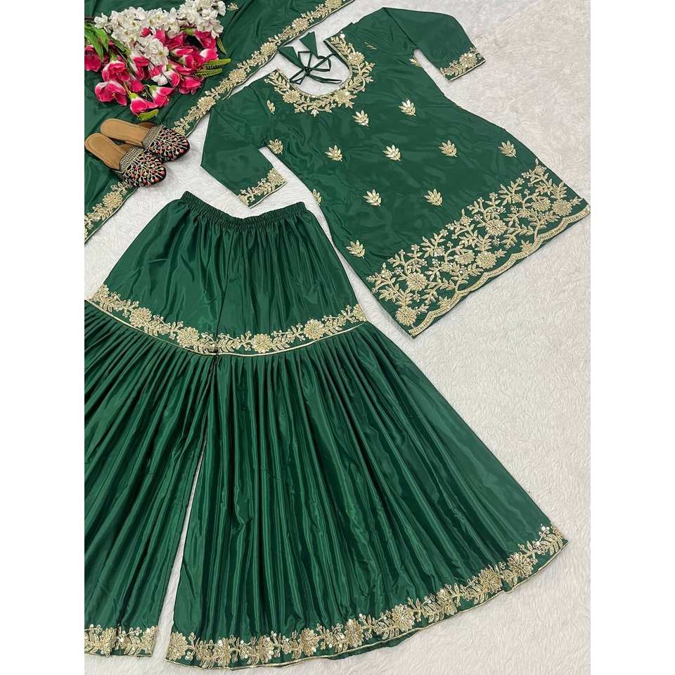 Ensemble de fête élégant ND Designer en polyester vert : haut Salwar Kameez avec pantalon Sharara Plazzo et Dupatta