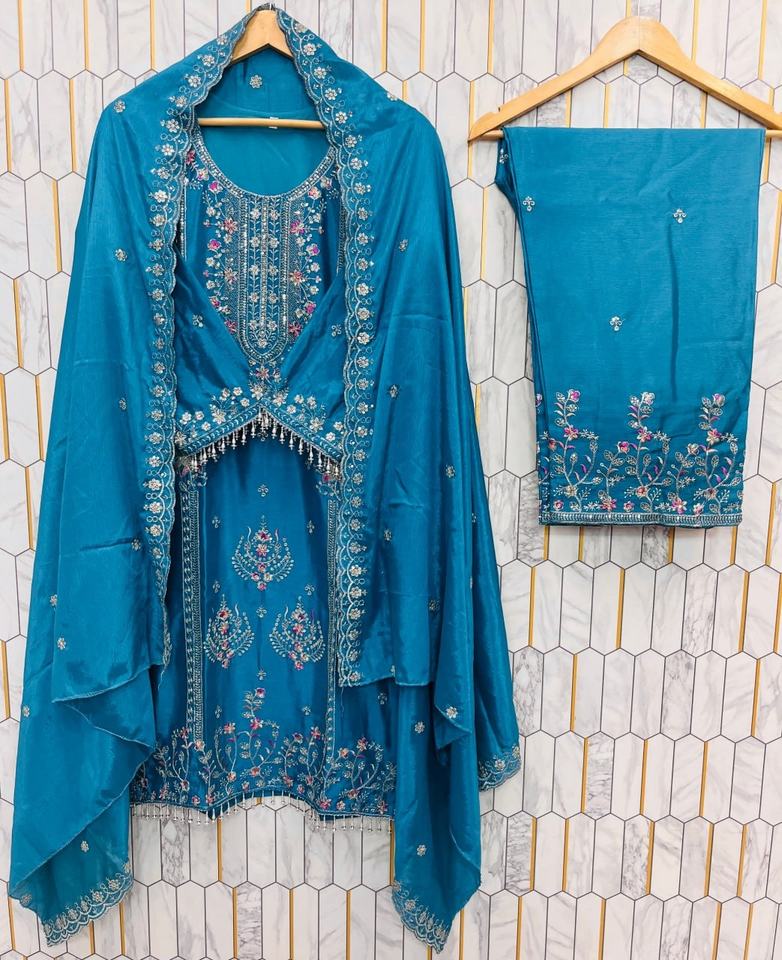 Designer Pure Chinon Broderie Séquence Partywear Salwar Kameez Heavy Dupatta Set avec OUTFIT TOP PLAZZO