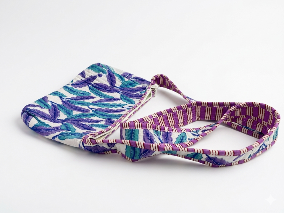 Sac à bandoulière en coton matelassé à imprimé feuilles bleues | Sac fourre-tout de voyage de haute qualité imprimé à la main pour femmes, pochette artisanale d'exception