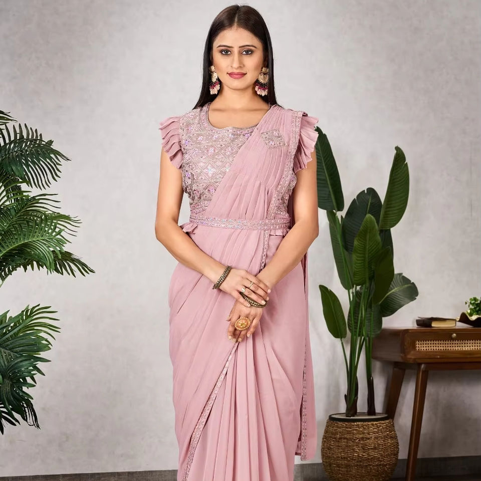 Saree en georgette douce prête à porter avec chemisier fantaisie, travail de séquence de broderie, tenue de mariage élégante de style pakistanais