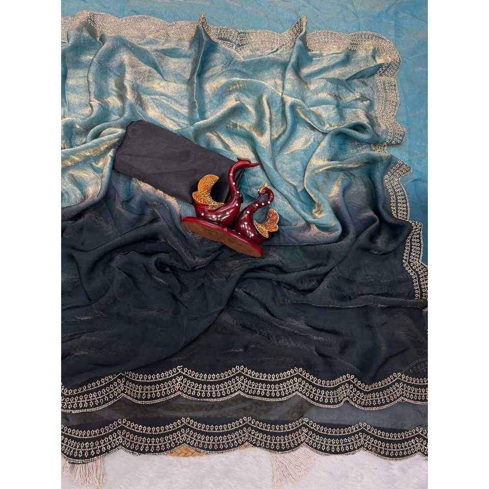 Designer Sky Color Unstitched Saree for Party Wear Handmade 100% Silk Organza with Diamond Jarkhan Work