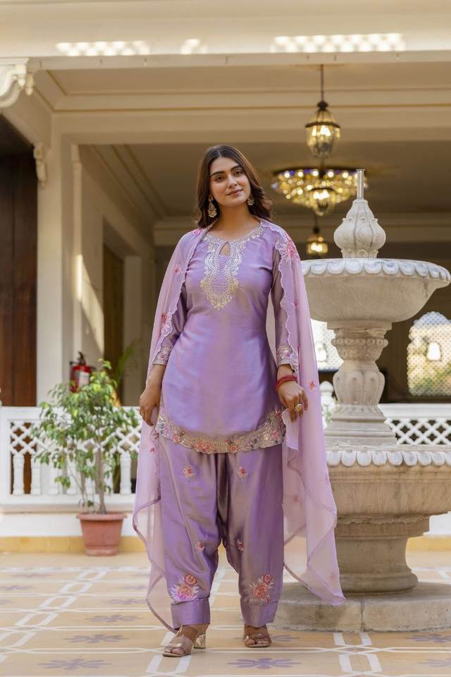 Ensemble de costume en satin de créateur avec broderie codée et dupatta en organza doux – Collection de vêtements ethniques