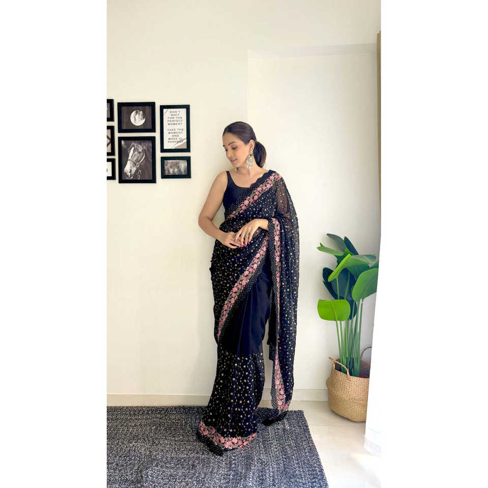 Robe élégante de carrière Saree à sequins et multi-broderies de créateur