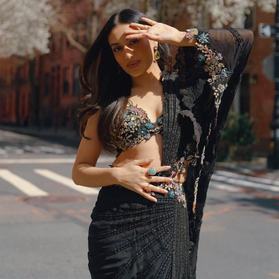 Sari fourreau de créateur avec broderies de sequins pour tenue de soirée, taille naturelle