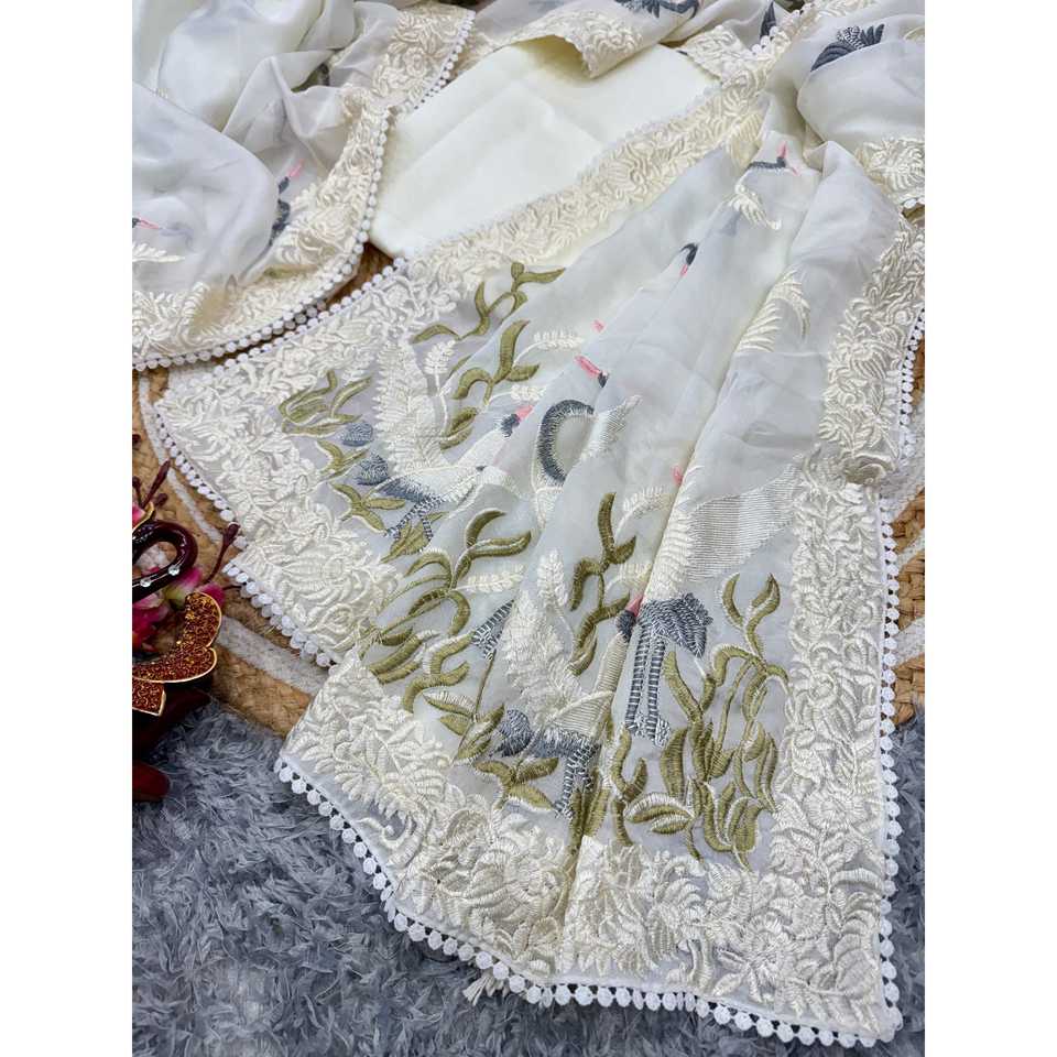 Superbe Saree en Soie de Créateur pour Mariages, Magnifique Broderie au Fil Blanc, Indien/Pakistanais, Non Cousu