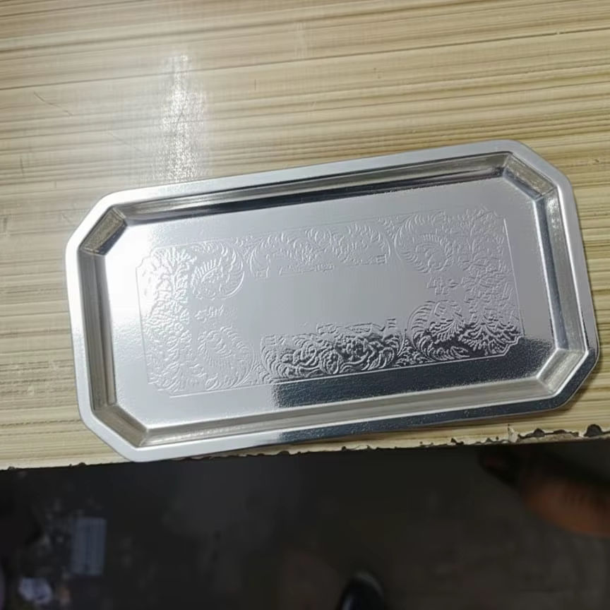 Plateau de service en métal plaqué argent de designer, plateau de service en acier inoxydable, écologique, poli, passe au lave-vaisselle, utilisation à domicile et au restaurant