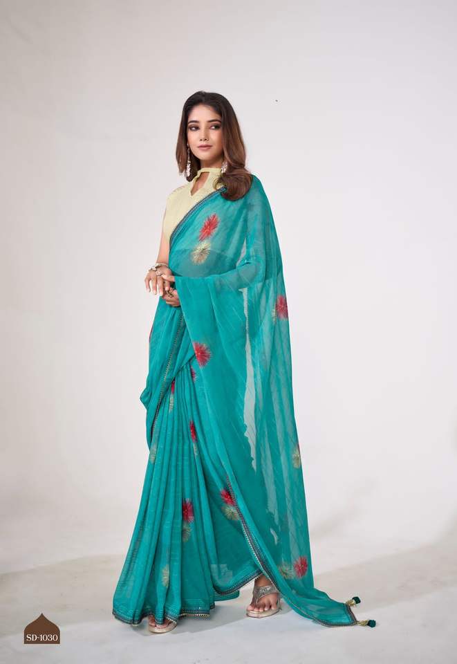 Sari en organza de soie fantaisie ethnique traditionnel de créateur, magnifique, en georgette douce avec travail de sequins, de haute qualité, pour tenue de soirée