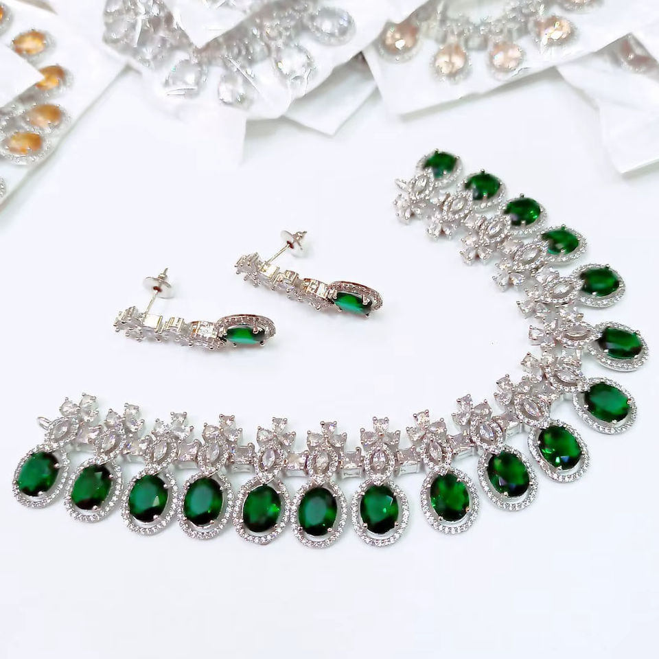 Ensemble de bijoux en cristal vert plaqué argent de style classique, collier et boucles d'oreilles de luxe pour mariage