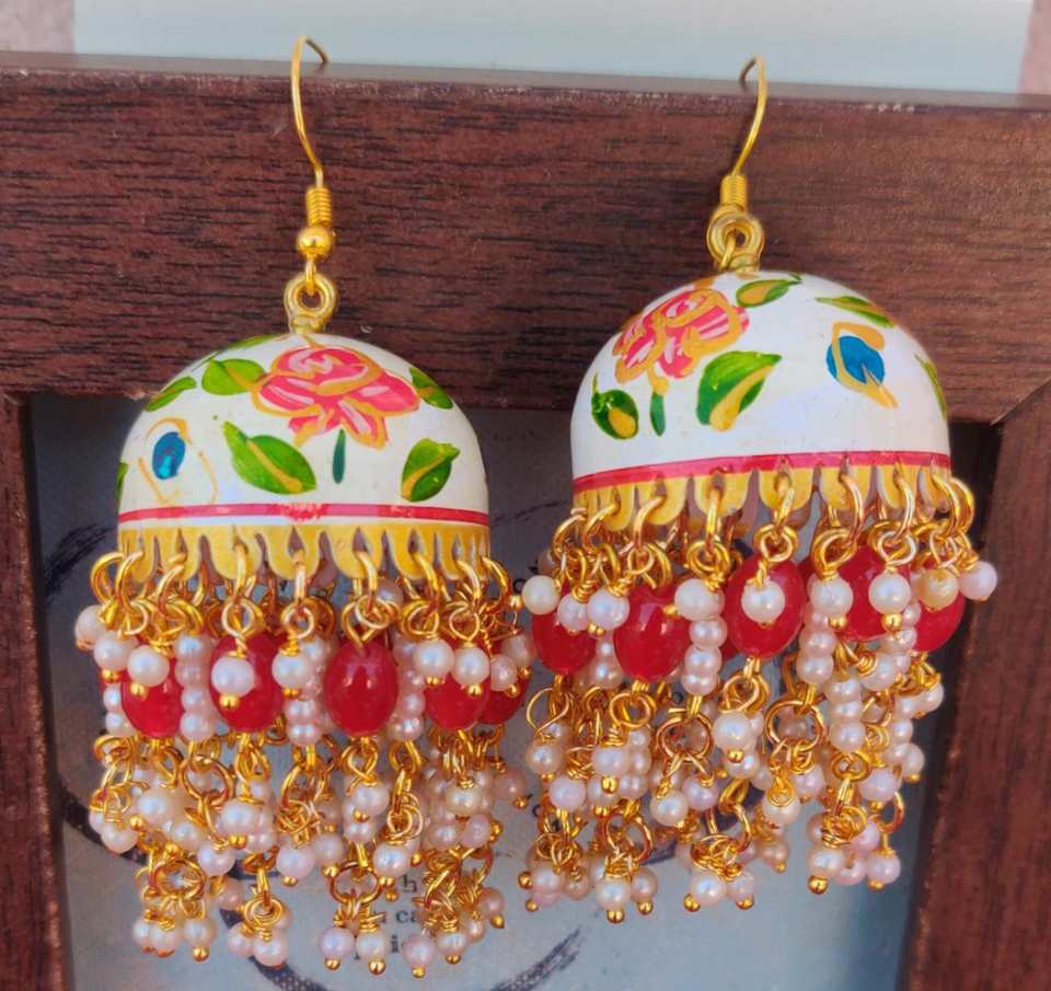 Bijoux ethniques traditionnels de créateur-Boucles d'oreilles Meenakari peintes à la main Tumbler rouge Mogra Jhumki Placage or Accents de perles faites