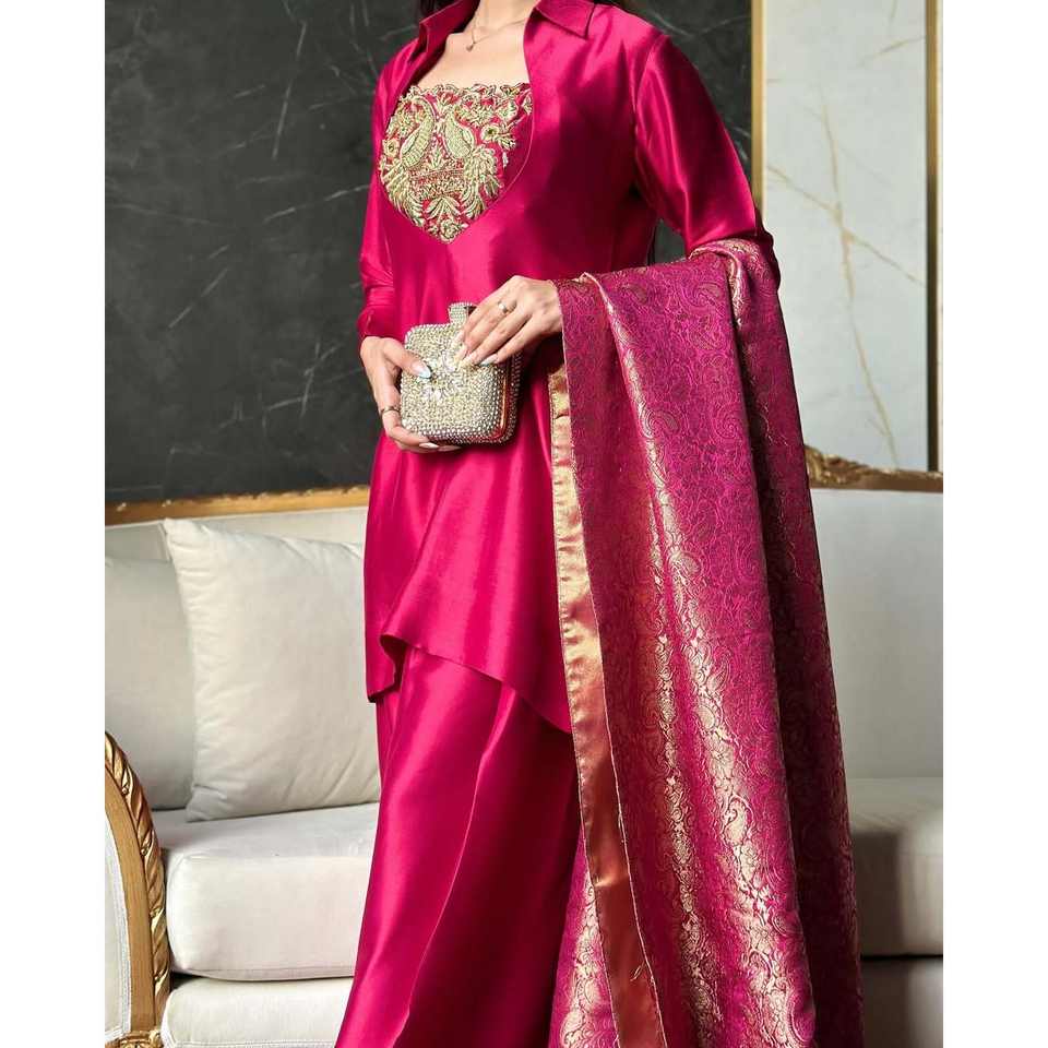 Designer Traditional Muslim Clothing & Accessories Party Wear Top with Farashi Salwar and Dupatta