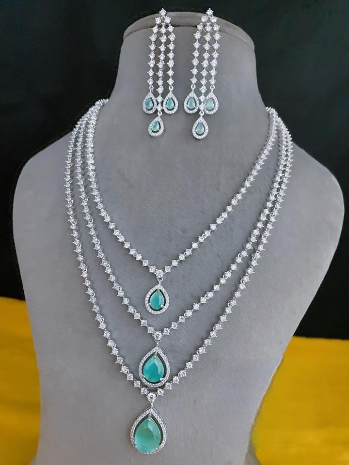 Collier de créateur tendance en zircon diamant à trois couches serti de boucles d'oreilles finition argentée avec look de pierre AD pour mariage pour femme