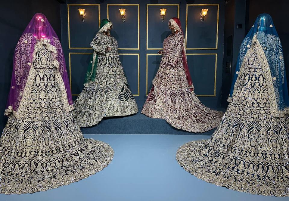Designer Velvet Lehenga de Taaj Collection avec broderie lourde Big Trail et travail de la pierre en quatre couleurs élégantes
