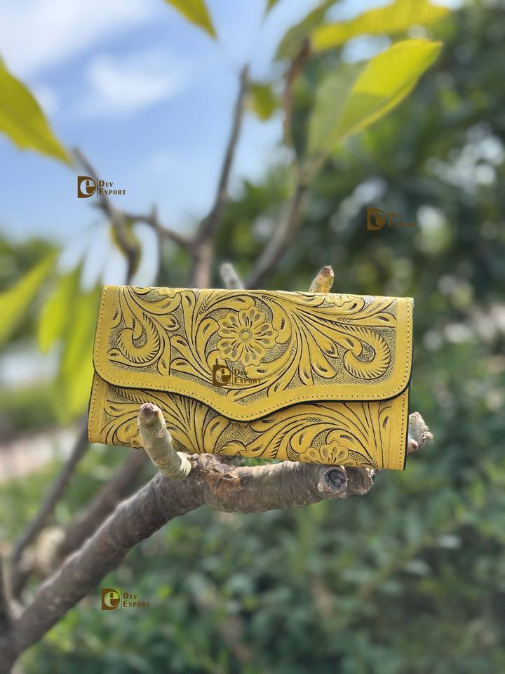 Portefeuille-pochette en cuir jaune élégant pour femme, avec gravure occidentale artisanale, multi-usages
